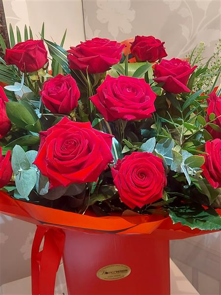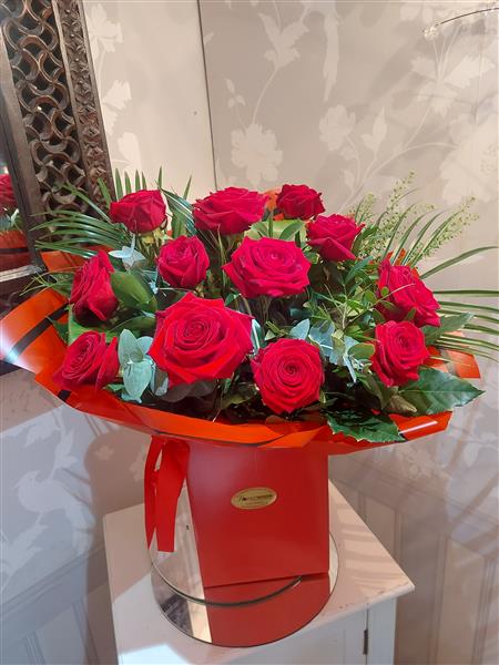 For the ultimate romantic gesture, 12 large luxury red roses and fresh foliage, beautifully arranged for your Valentine